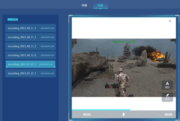 在实训室内搭建云台摄像机,实现全3D场景,360度自由转换观察角度,第三人称视角,学员操控的虚拟学员角色可以在3D场景中自由行走,并显示所有参训学员的位置、状态等,并以画中画的形式显示参训学员的第一视角画面,以及他们的虚拟UI操作界面,显示训练任务和完成情况。通过多角度的可变焦云台摄像头进行学员实操记录。导师可通过工作站控制角度可变的第三人称视角,对操作者、伤患医疗场景,以及3D虚拟交互和操作过程进行监控,并通过摄录系统对操作者对真实模型操作过程进行摄录,从而满足导师为团队训练和情景化训练的评估和反馈所需的素材,真正实现环境评估、临床思维、技能操作等单项和综合技能的反馈与评估。