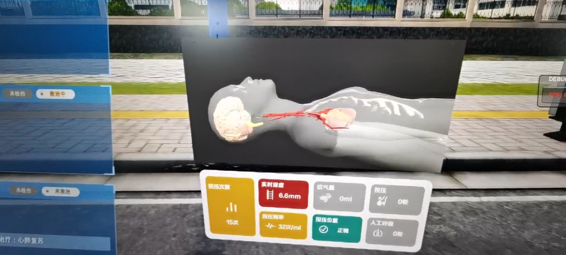 通过结合MR显示技术、物联网技术,实现学员在3D全虚拟场景下,在模拟人上的完成所有模拟人支持的救援实操,支持实时心肺复苏显示参数、支持显示脑部供血效果。